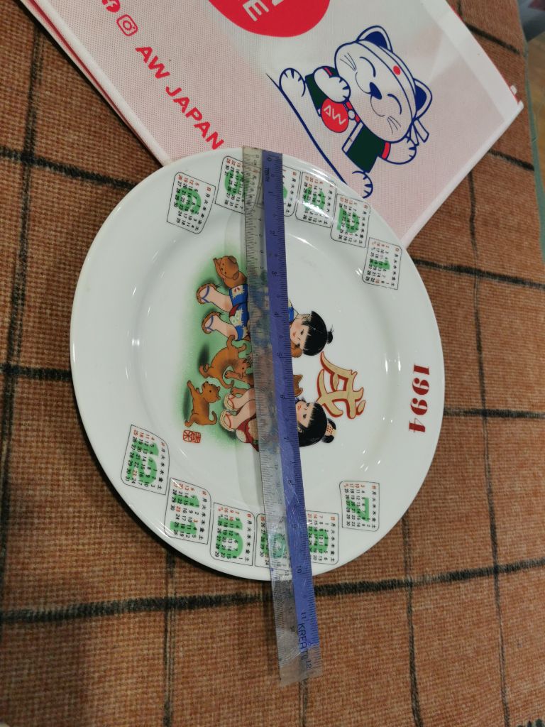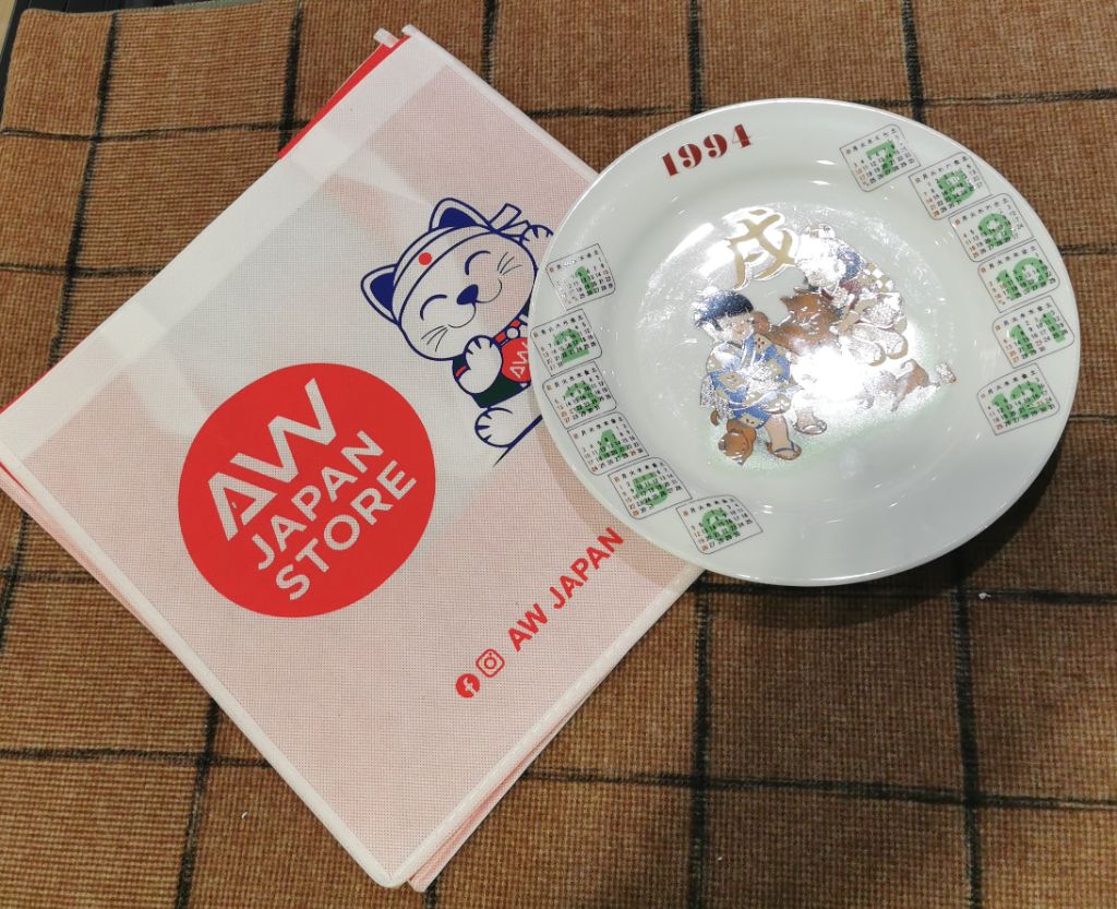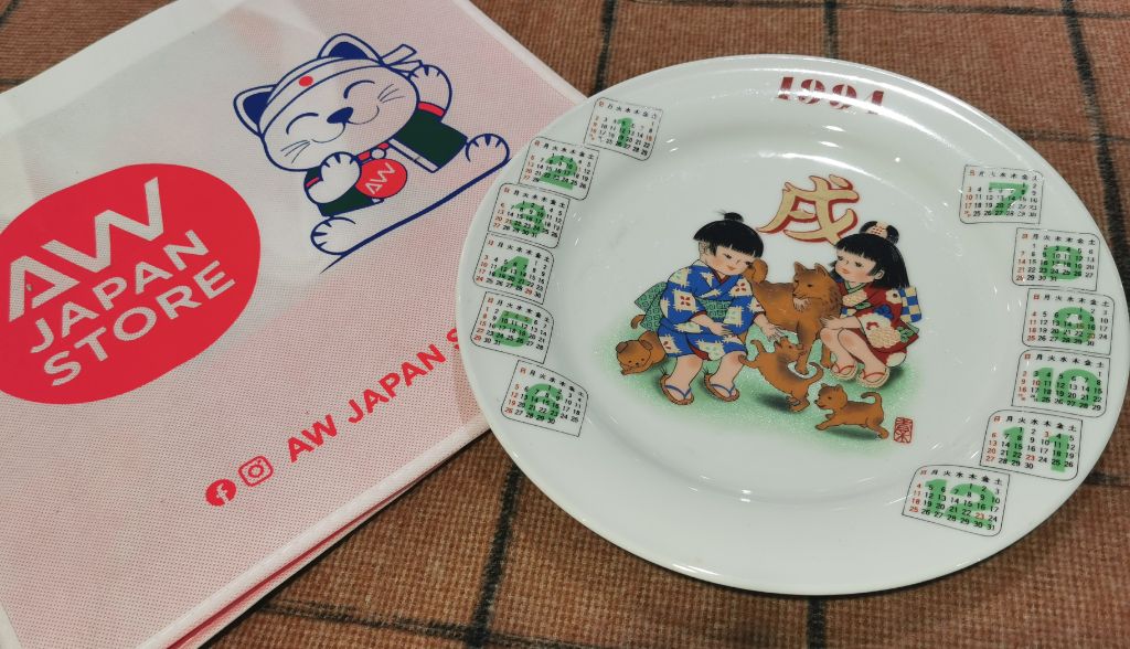 featuring the year of the dog (戌). The plate has a white background with the year "1994" printed at the top in red. In the center, there are two children dressed in traditional Japanese clothing, surrounded by several dogs. Around the edge of the plate, there are twelve small calendar grids, one for each month of the year. These grids are in green and white, with the numbers of the days printed in black. The Japanese character for "dog" (戌) is prominently displayed in gold above the children.